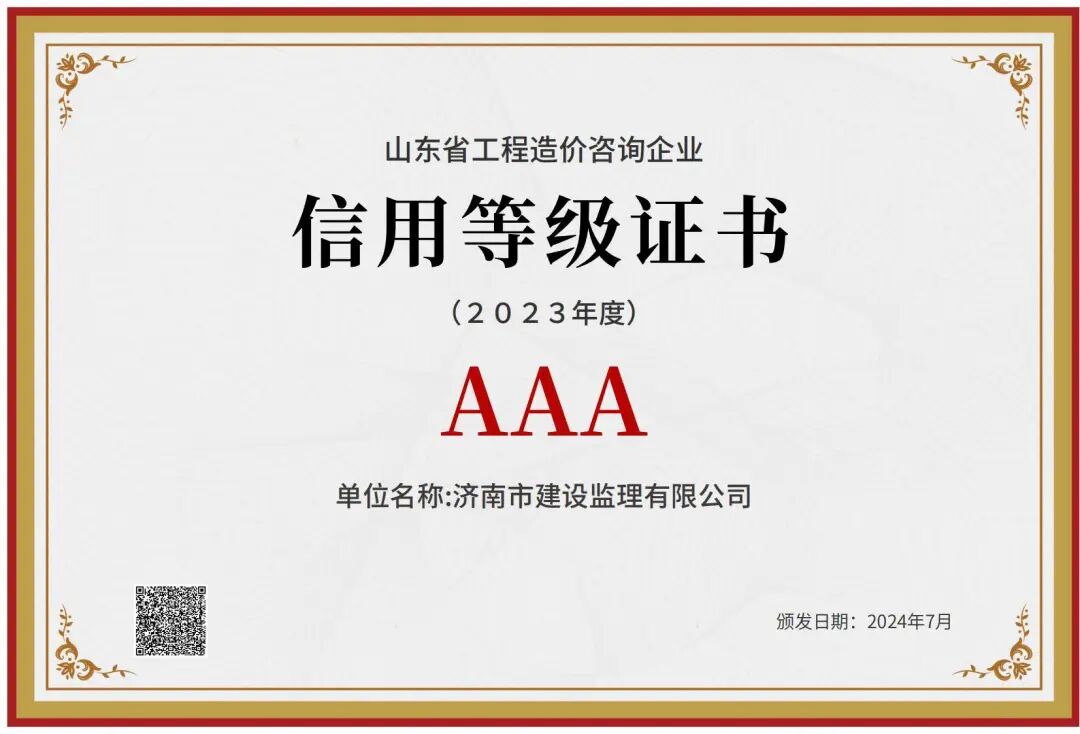 喜報(bào)!濟(jì)南監(jiān)理獲評(píng)2023年度山東省工程造價(jià)咨詢企業(yè)信用等級(jí)評(píng)價(jià)AAA等級(jí)